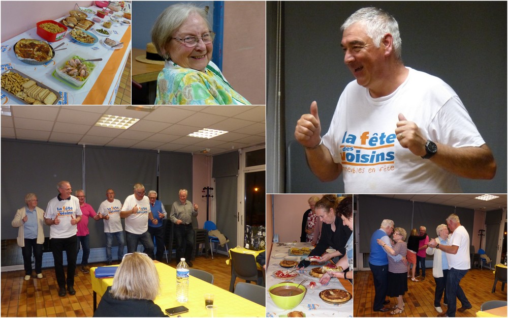 Bon, ok, vous remarquerez l'absence de nos "jeunes" voisins ! pas faute de les avoir invités. Ils ont eu tort car nos plats mis en commun ont été un régal (clic sur les panoramas). En haut à droite, notre bout en train de Président du Comité de quartier, Bernard Leclercq. En haut au milieu, Colette Delaby, secrétaire.