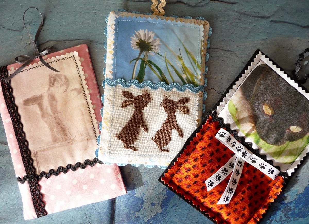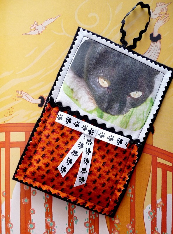 Et hop là, "l'ombre" sans oreilles cette fois, sur du tissu ! quelques coups de ciseaux cranteur, pic-pic, un tiot noeud, bouréboure de lavande (vive l'été