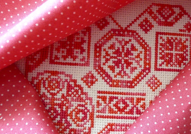 Un p'tit bout de p'tit coeur de Gazette 94, que je dois finir avec ce tissu à p'tit pois. J'ai aimé broder avec ce fil rose-changeant.
