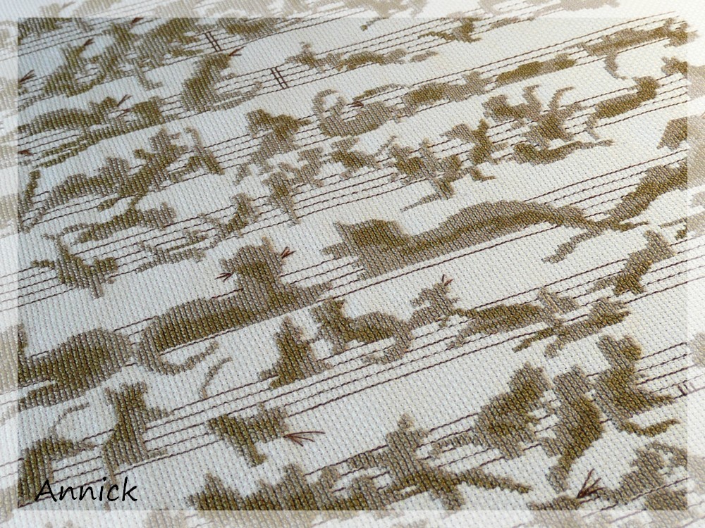 Très agrandi (3 cm en réalité) où l'on peut constater que mon aiguille ne piquait pas toujours où il le fallait !!! vous remarquerez aussi tous les demi-points à faire dans cette toile 7pts/cm ! pour les portées, "le" fil s'enfonçait dans la toile une fois sur deux !!! mais bon, merci tout de même très chères lunettes !