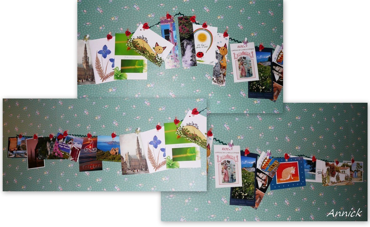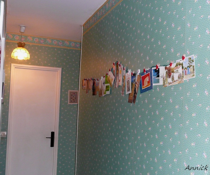 Toutes vos cartes postales ... et vous voyez que je dois déjà rajouter une deuxième corde à lin... à cartes ! chaque fois que je passe dans mon couloir : coucou tous mes amis du net !
