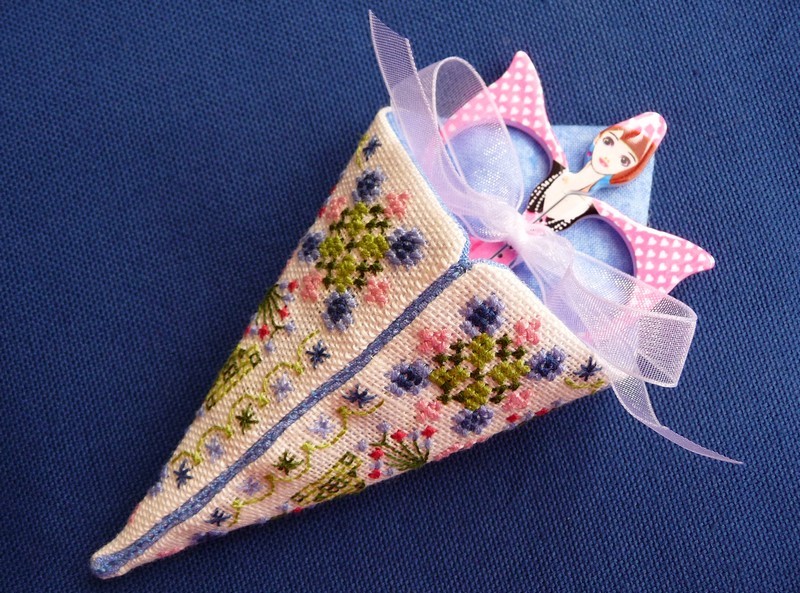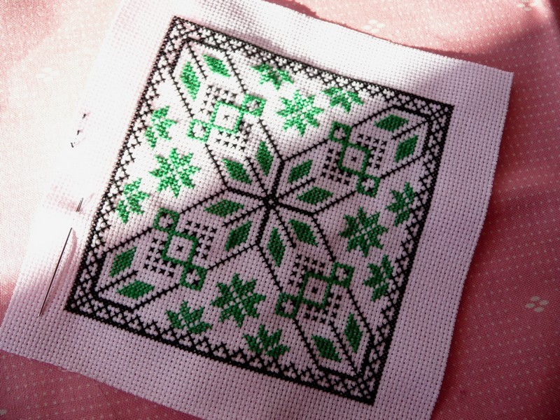 Pendant qu'elle dort, je récupère une broderie que j'avais faite d'après une grille de Liselotte (clic) (merci beaucoup Liselotte) pour en faire un porte-ciseaux, recto :